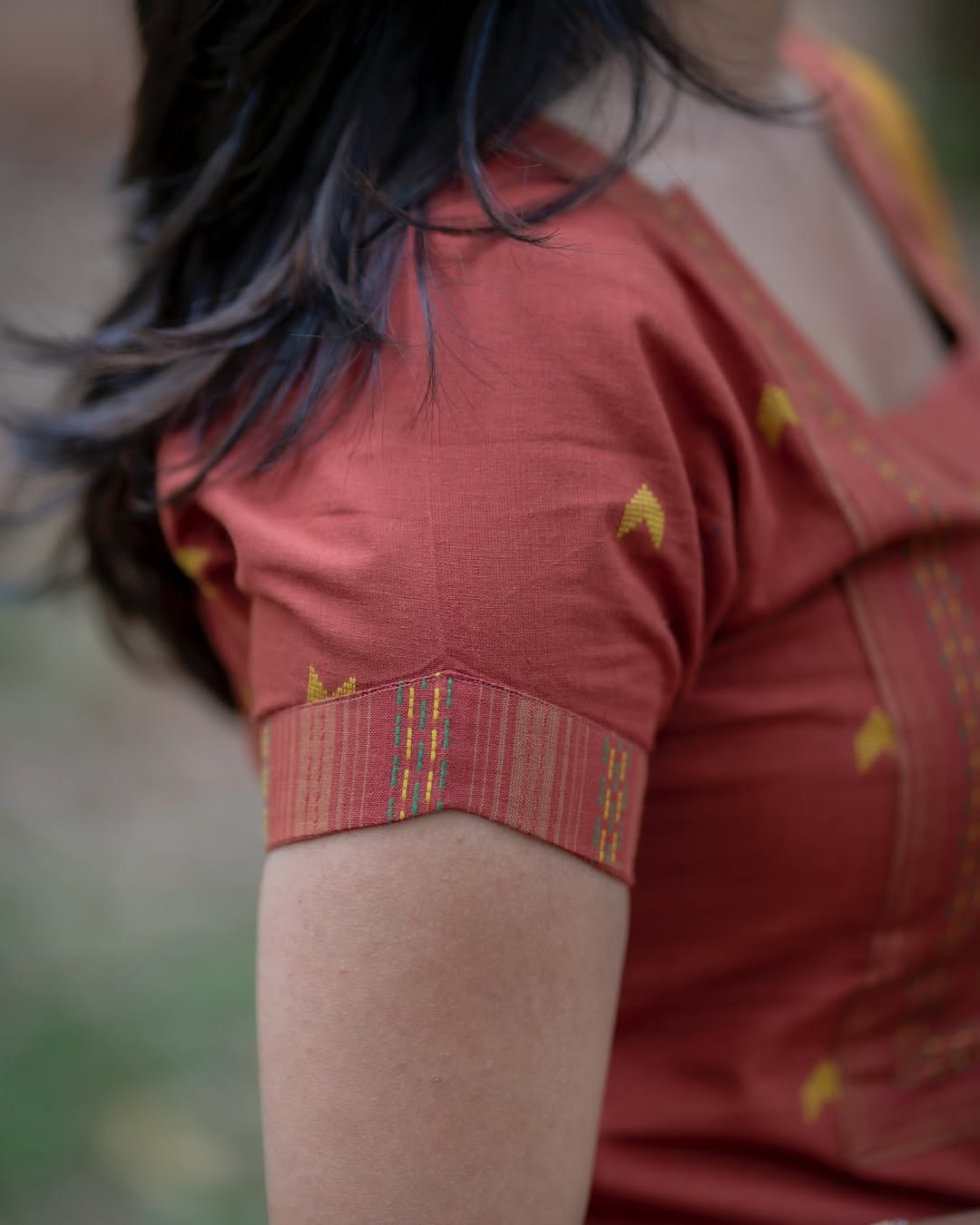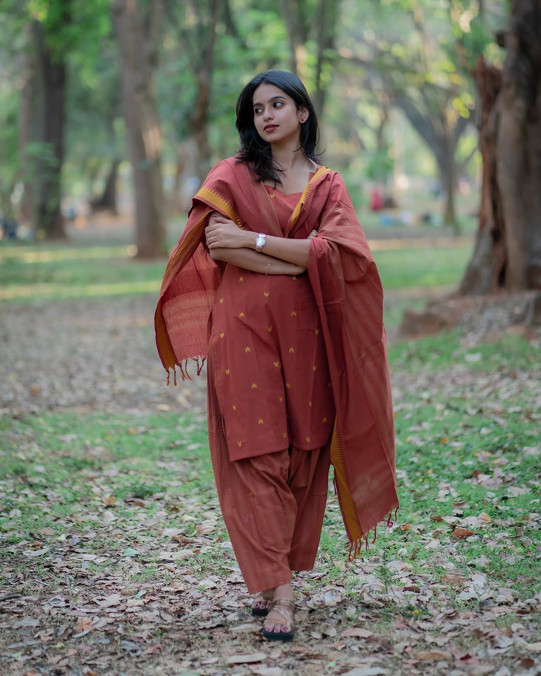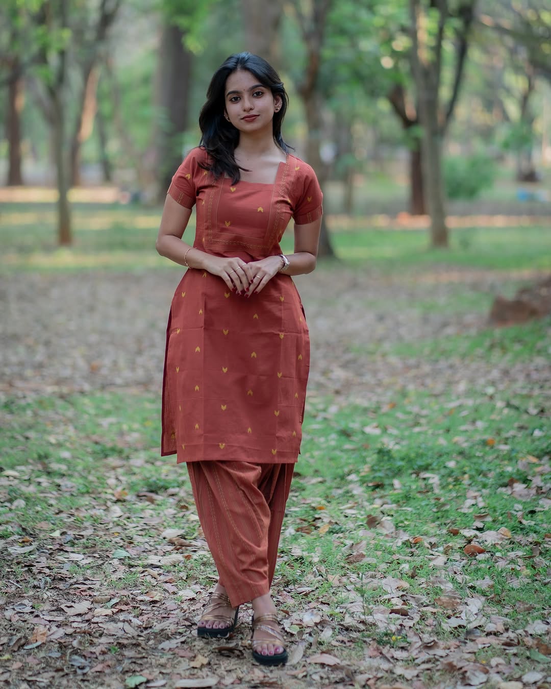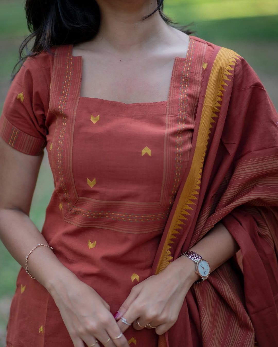 Embrace timeless beauty with this elegant combo set, thoughtfully designed for the modern fashion enthusiast. The terracotta-colored top boasts a square neckline enriched with intricate yellow embroidery patterns that radiate sophistication. The short sleeves feature pearl-like button detailing along the hem for added charm. Coordinated with breezy palazzo pants and a dupatta embellished with a yellow zigzag border and tasseled edges, this outfit offers both style and comfort. Whether for formal occasions or casual gatherings, this ensemble is guaranteed to make a lasting impression.