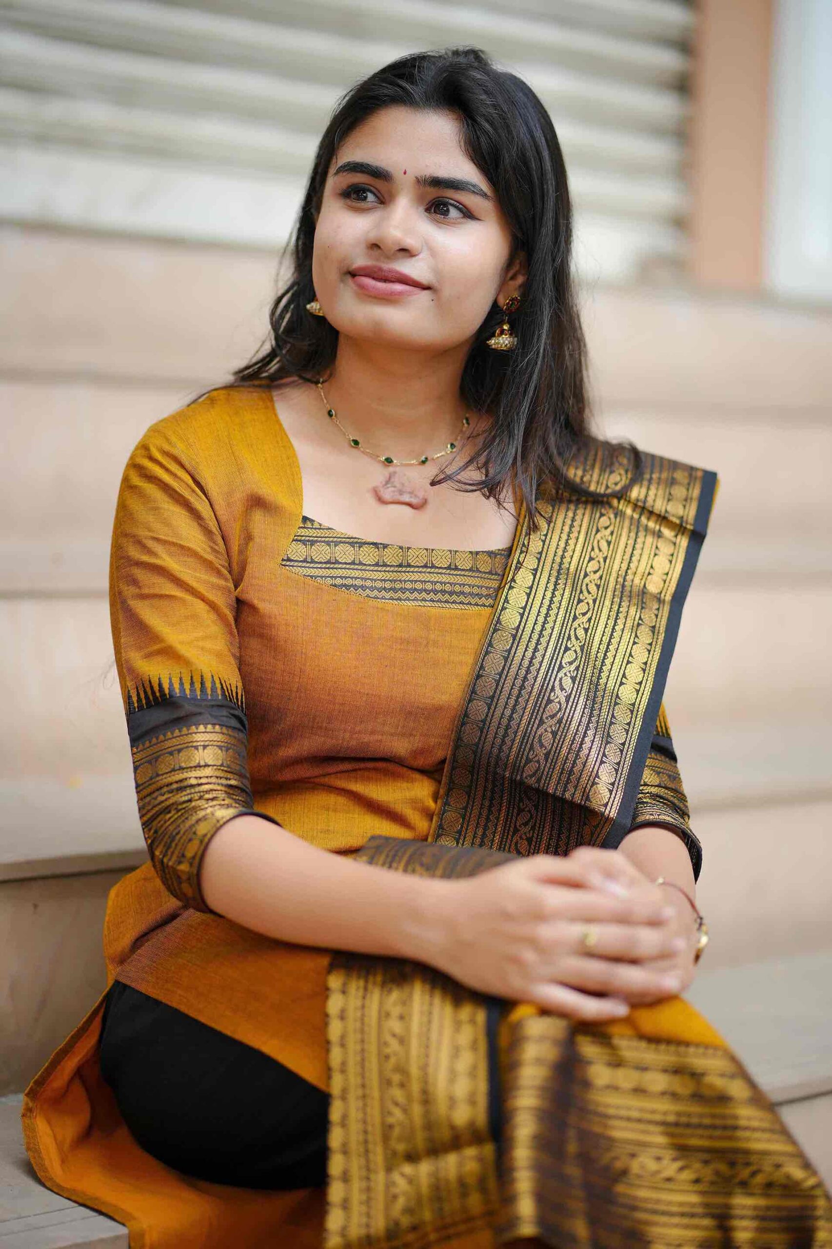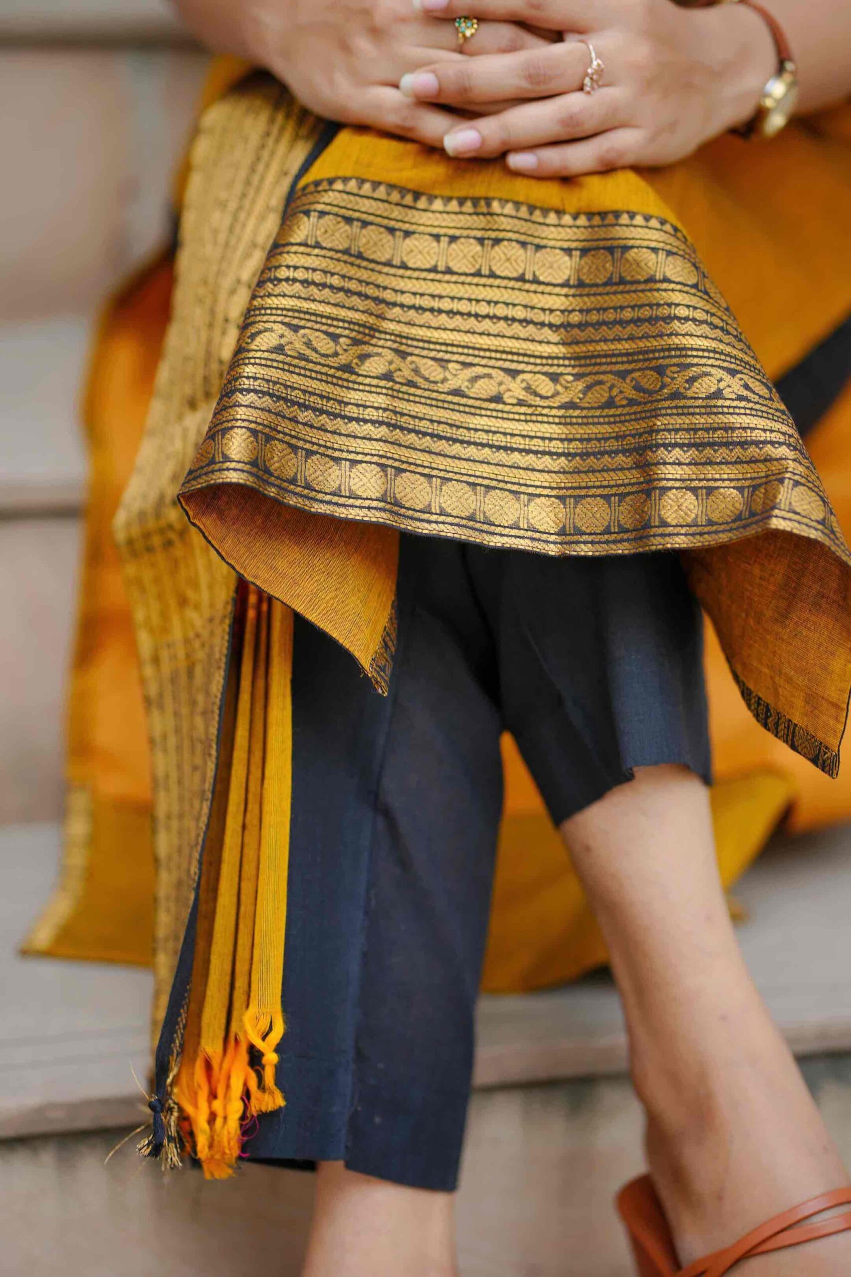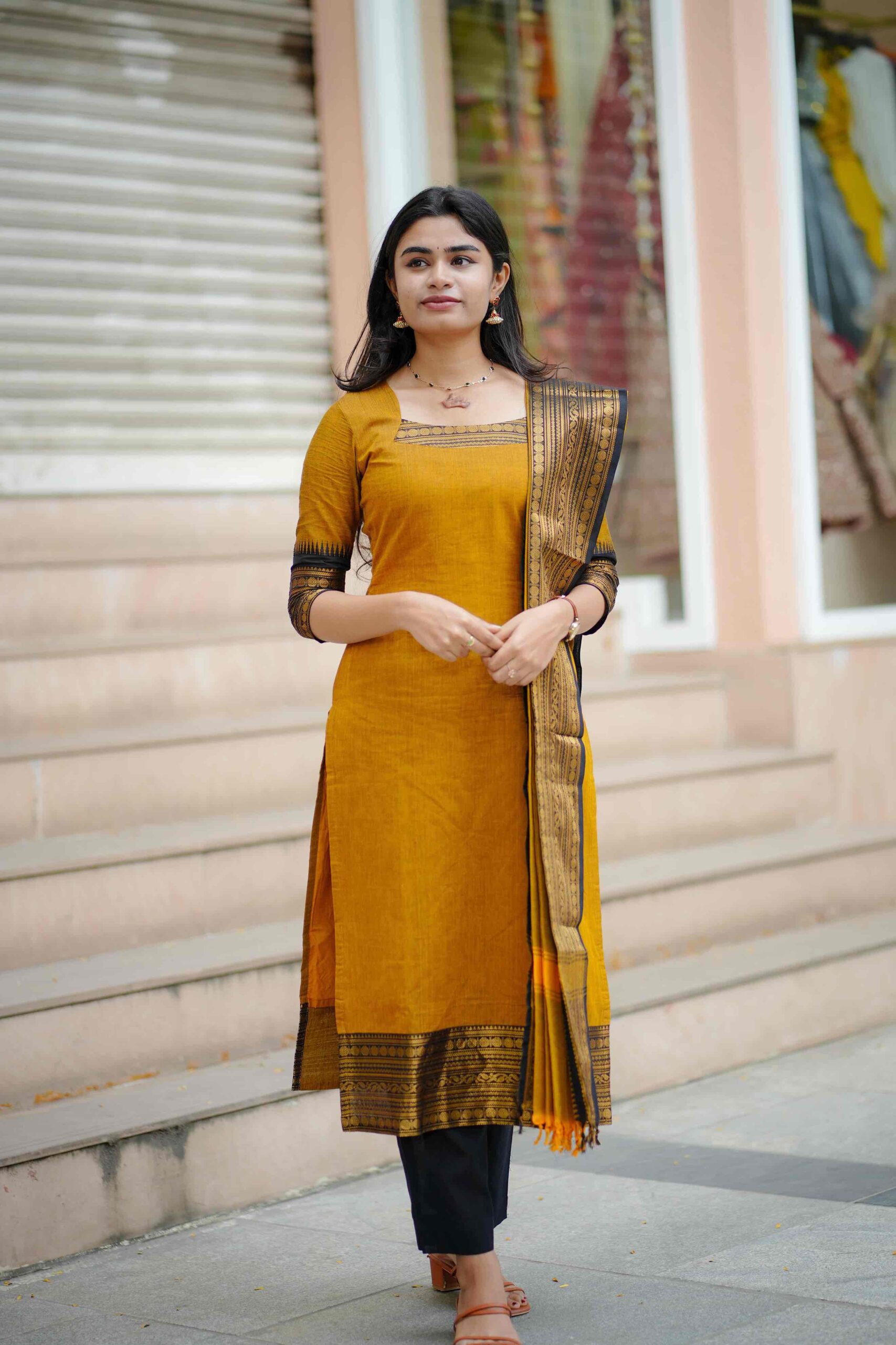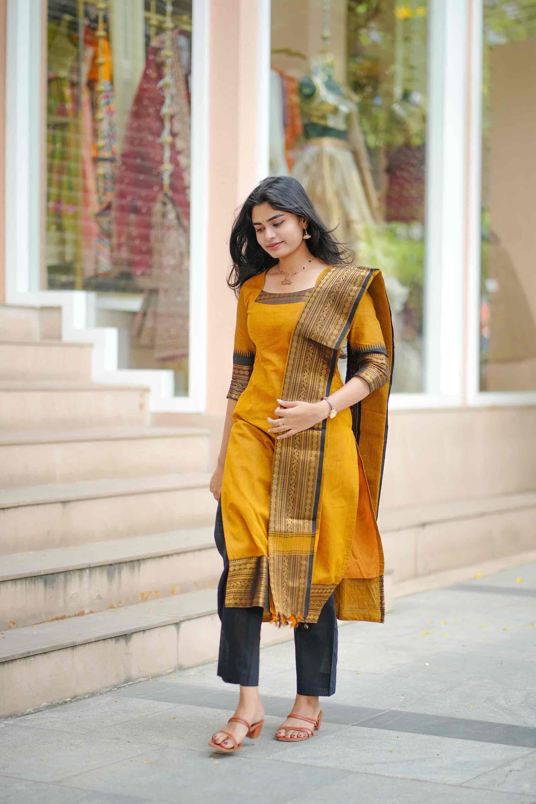 Turn heads with this mustard kurti set crafted with a rich woven border that highlights the neckline, sleeves, hemline, and dupatta edges. Paired with sleek black pants and a matching dupatta, this set blends tradition with modern grace perfect for festive gatherings or elegant everyday wear.
