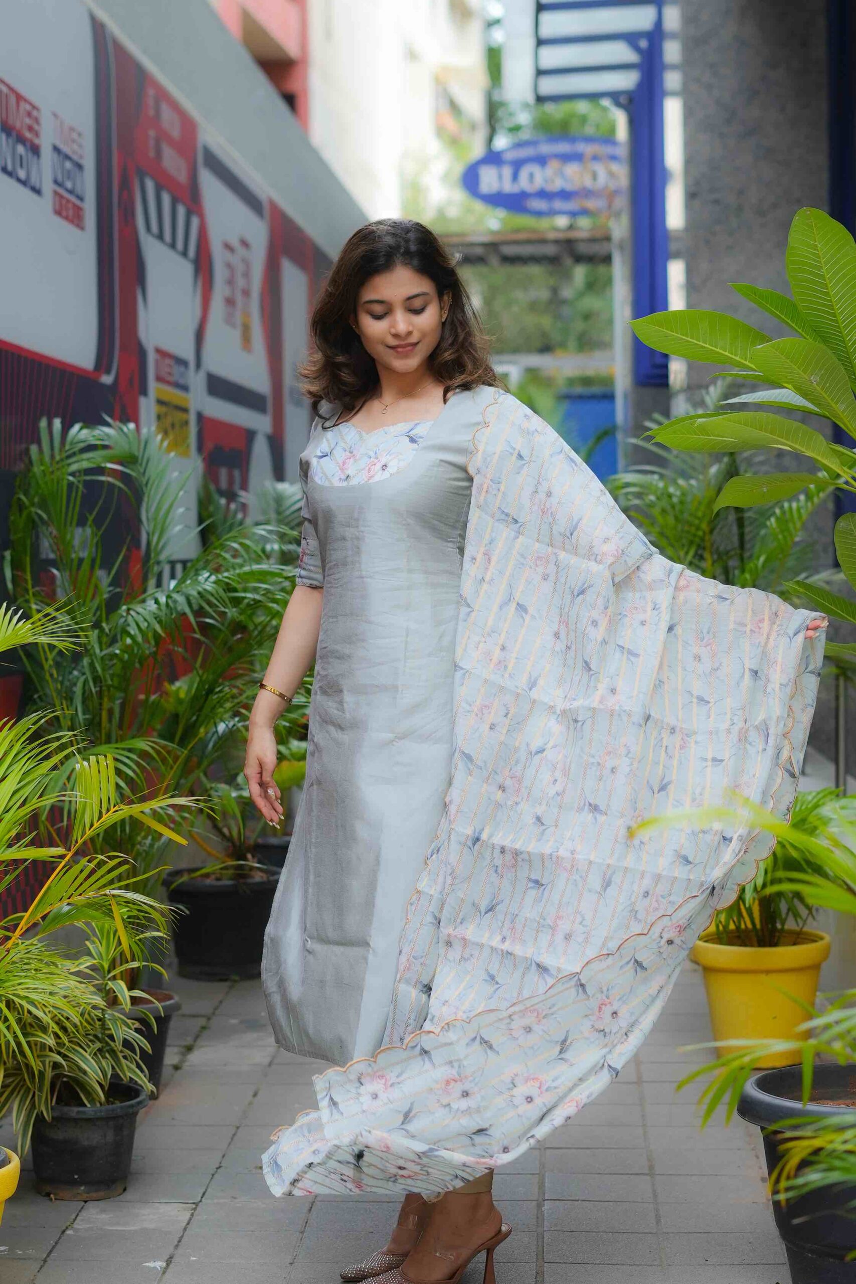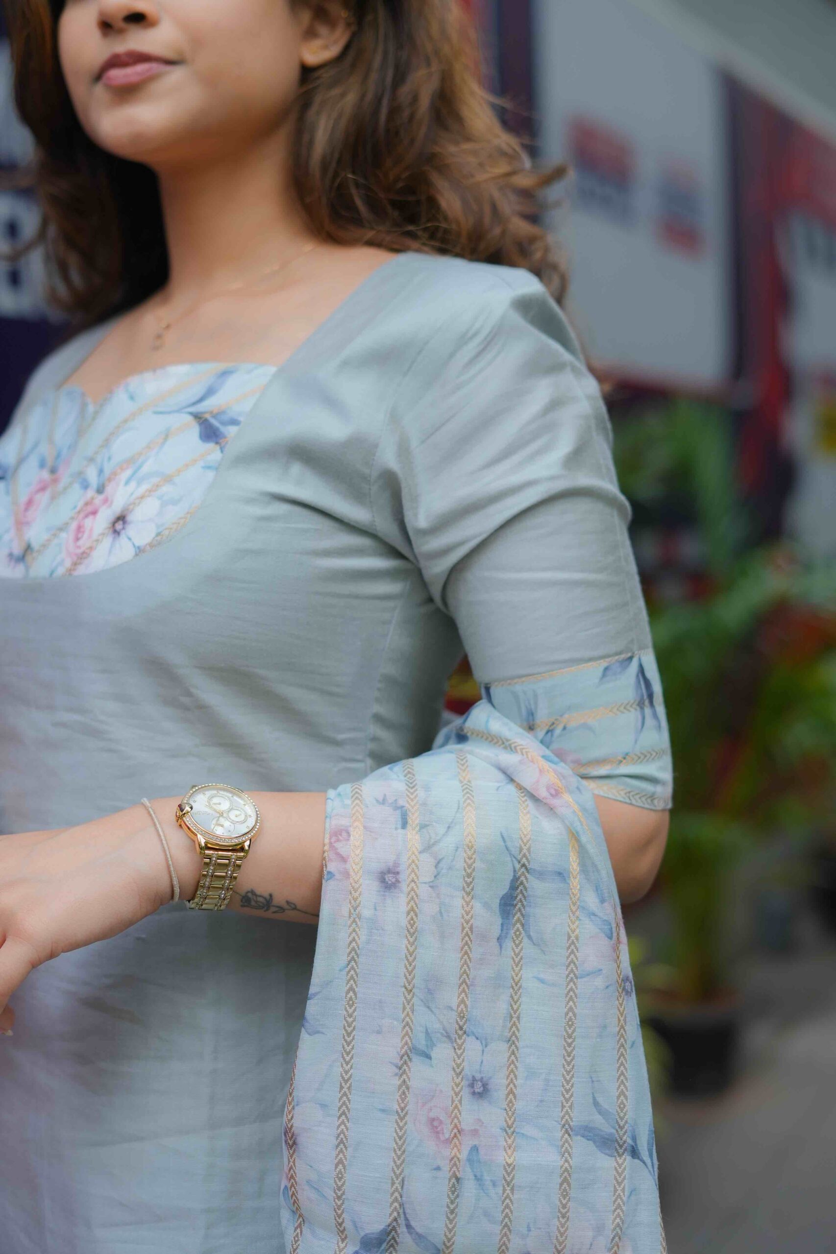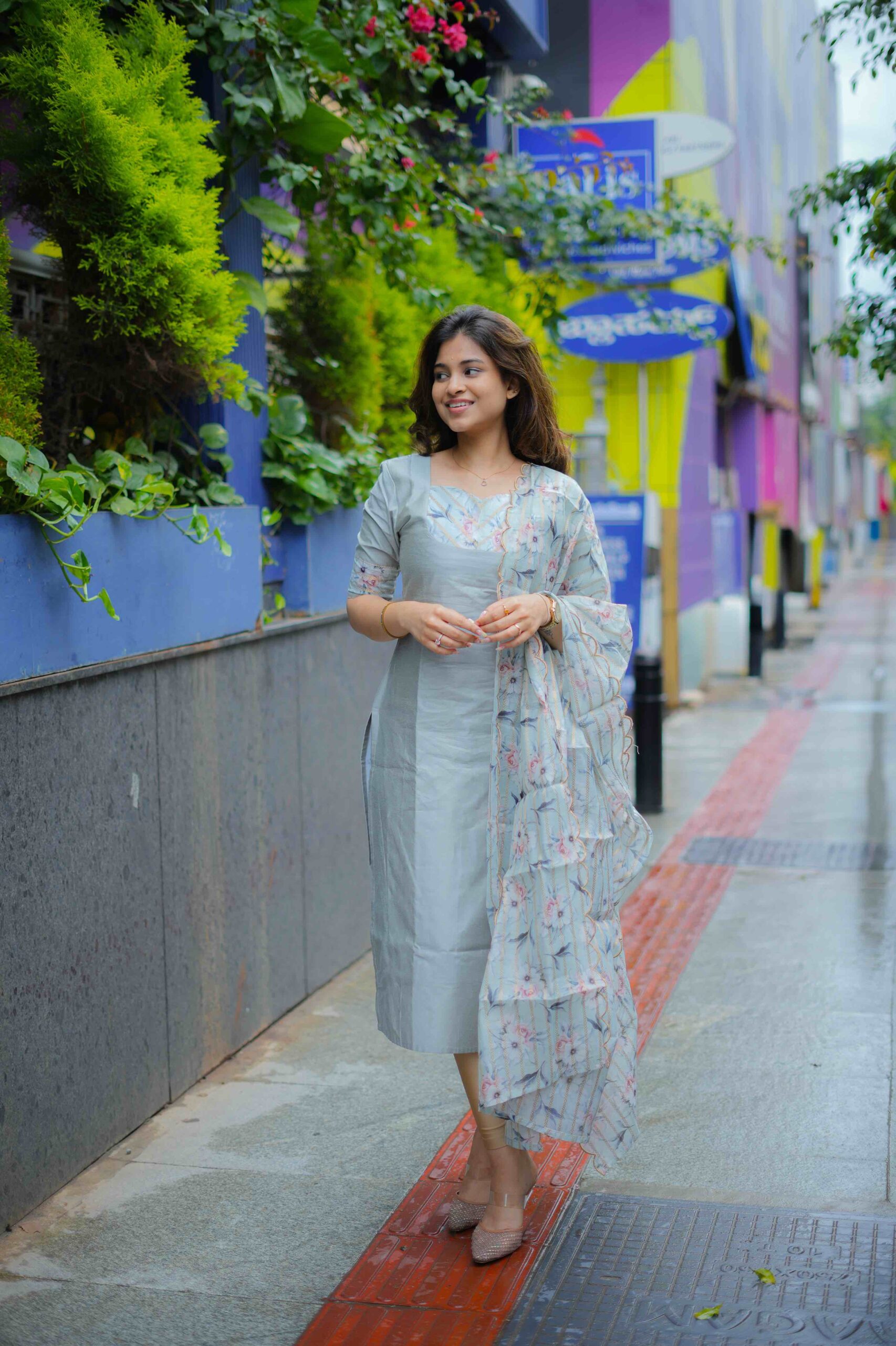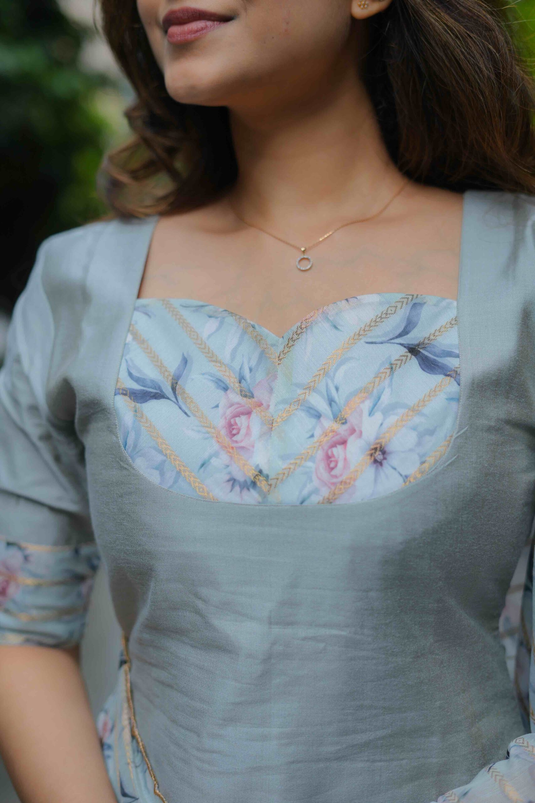 Refined in tone and rich in detail, this grey kurti set is made for effortless charm. The romantic neckline, framed with rose-hued thread embroidery and gold accents, creates a dreamy focal point. Flowing into a relaxed silhouette and paired with a delicate floral dupatta edged in soft ruffles, this ensemble is the perfect blend of class and whimsy — a Barbie-core moment with a touch of tradition.